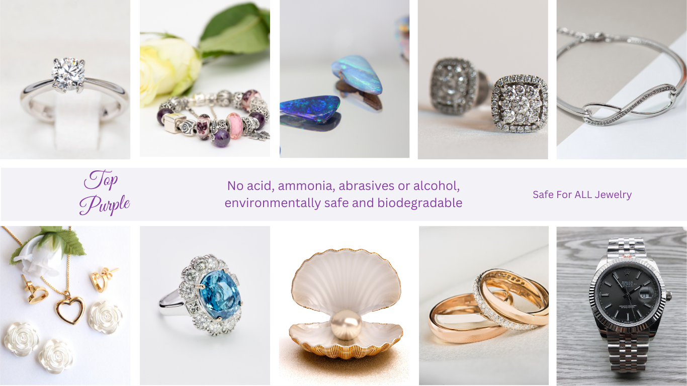 Top Purple is an easy, one step process (no nasty black paste mess) that will clean any gem or stone safely. Use it on diamonds, rubies, emeralds, gold, silver, costume and antique, even opals and pearls. No acid, ammonia, abrasives or alcohol, environmentally safe and biodegradable. Keep your Pandora, tiffany, and David Yurman collection showroom gorgeous. Great on Rolex also.